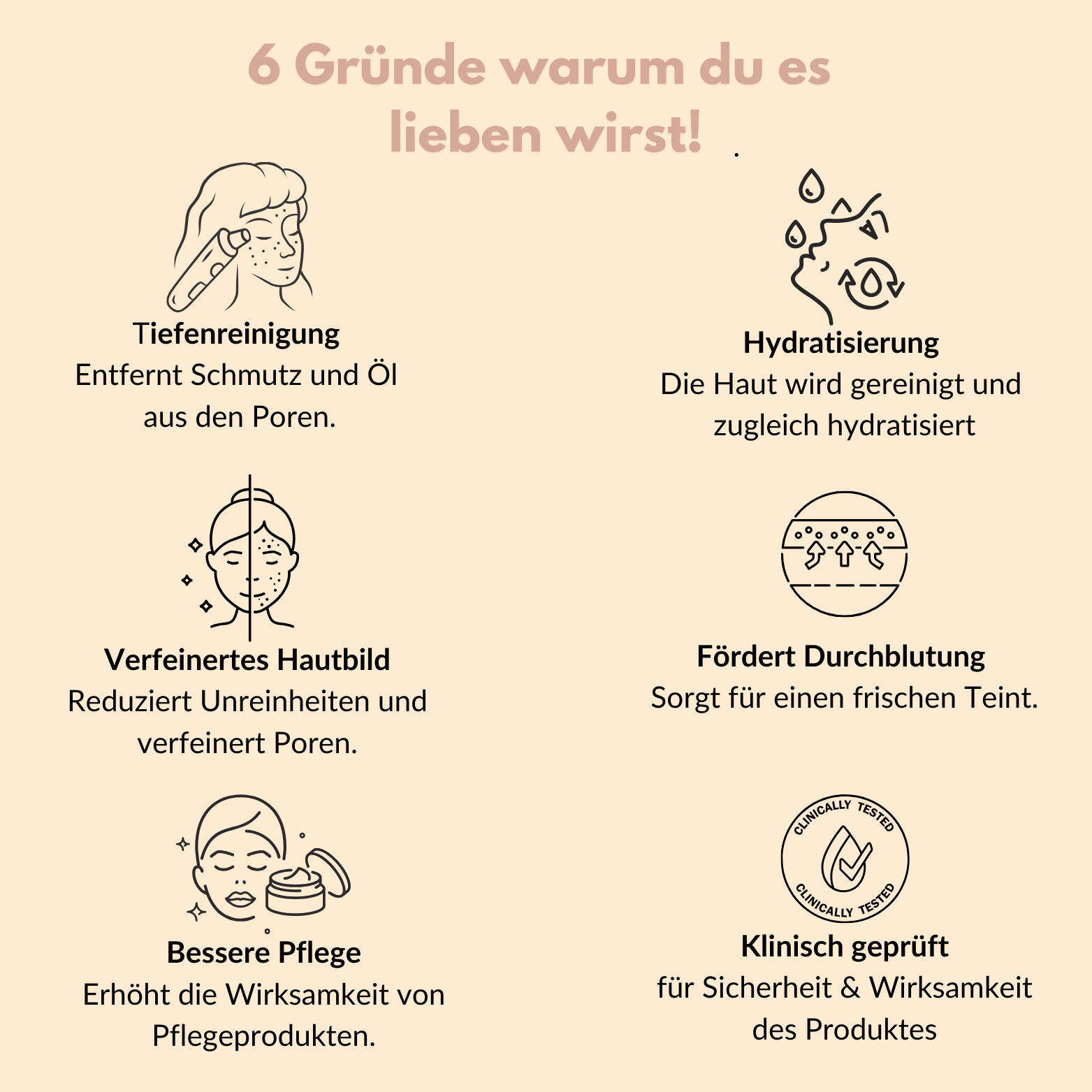 Hydratisierung: Während der Reinigung wird die Haut kontinuierlich mit Feuchtigkeit versorgt, sodass sie nicht nur gründlich gereinigt, sondern auch hydratisiert und erfrischt bleibt.